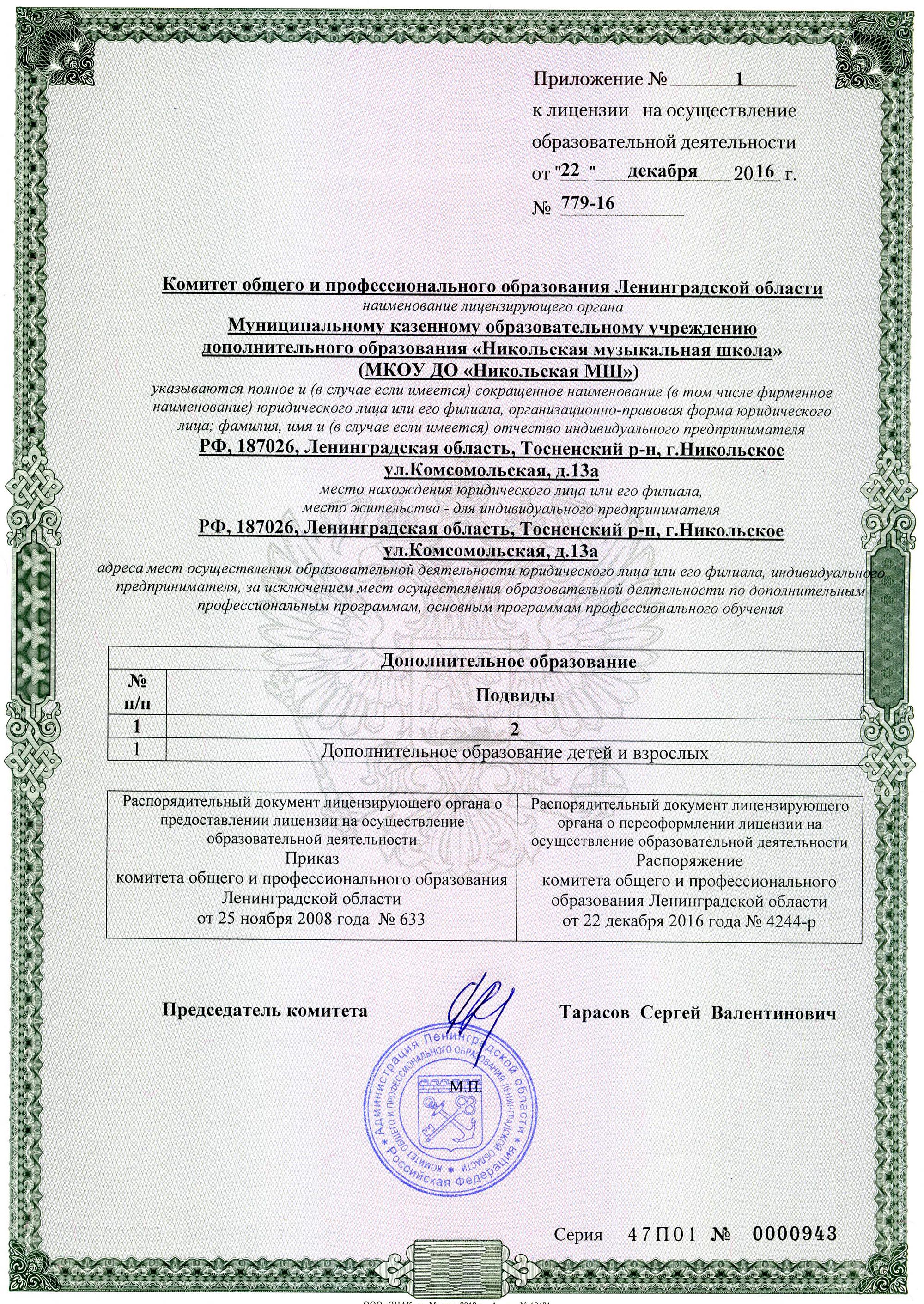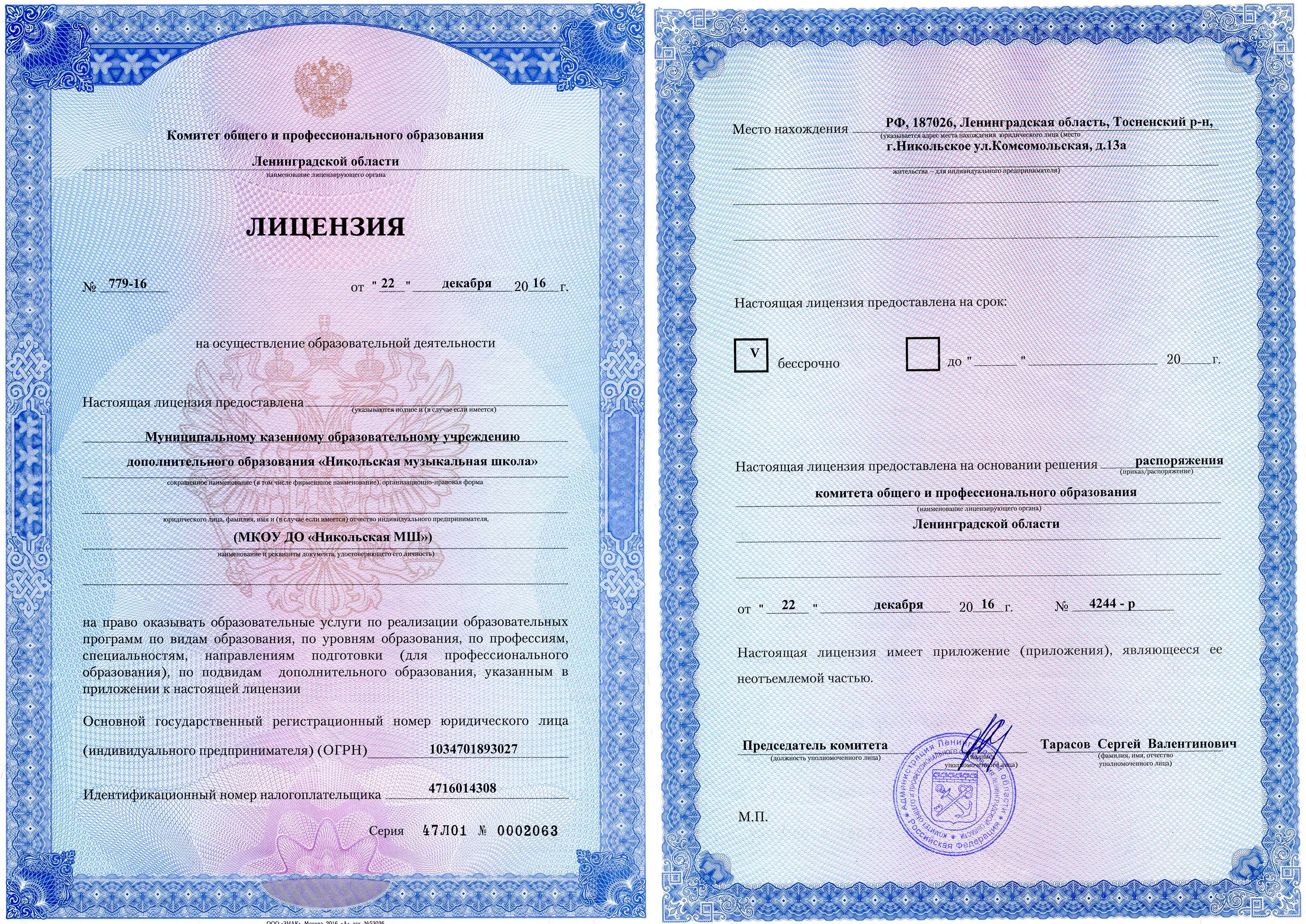 Лицензия на осуществление образовательной деятельности МКОУ ДО «Никольская ДМШ» >>